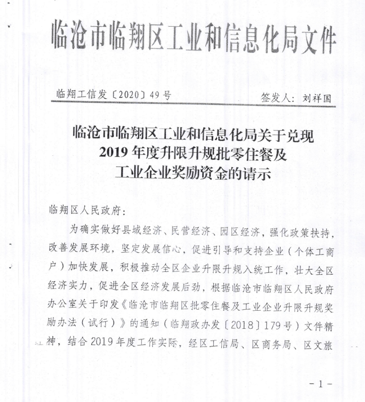 臨滄銷售部 報道 按照《臨滄市臨翔區(qū)工業(yè)和信息化局關于兌現2019年度升限升規(guī)批零住餐及工業(yè)企業(yè)獎勵資金的請示》(臨翔工信發(fā)〔2020〕49號)及臨滄市臨翔區(qū)人民政府的批復,云南省鹽業(yè)滇南有限公司臨滄銷售部獲得2019年度批發(fā)、零售企業(yè)升限升規(guī)獎勵8萬元,2022年1月6日該獎勵資金已由臨翔區(qū)商務局撥付至臨滄銷售部基本戶。 (張玉芳 文/圖 )
